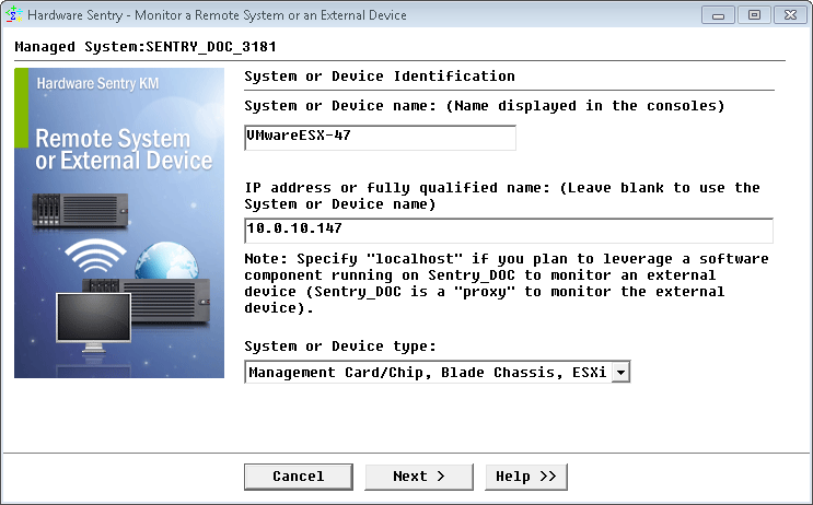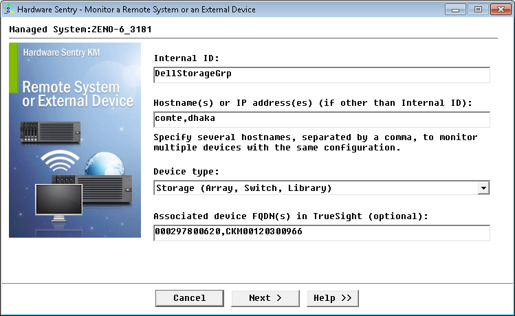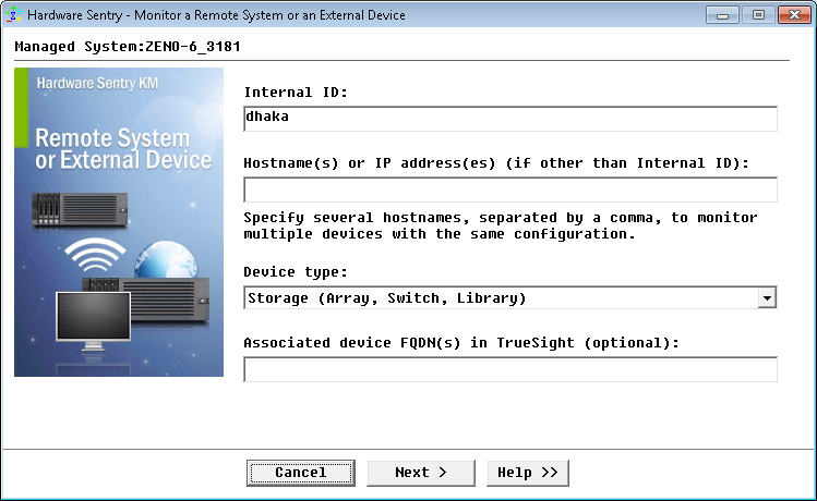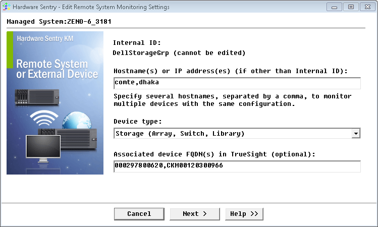 Second case: The disk array requires the installation of a management software tool on a separate server or workstation, like the EMC CLARiiON systems. The disk array management tool acts as a “proxy” with the disk array itself. You need to install the PATROL Agent and Hardware Sentry on the server or workstation where the disk array management tool is running. By default, Hardware Sentry will monitor the hardware components of the server or workstation it is running on. Add a remote host to make Hardware Sentry also monitor the disk array through the management “proxy”. Enter the System or Device name and specify “localhost” as the IP address. This will make Hardware Sentry send its SMI-S/WBEM queries to the local management software tool.
