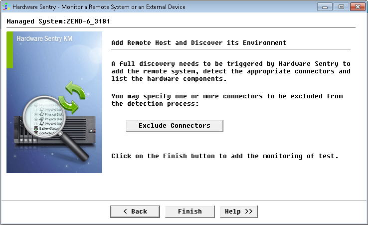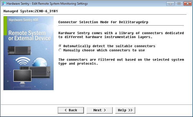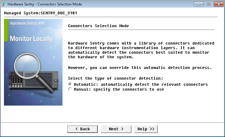 - (Default and Recommended) Automatic: automatically detect the relevant connectors: In this mode, Hardware Sentry will run tests at each discovery and select the connectors that best match the managed system. You will however be able to exclude connectors from the detection process (see step 4).