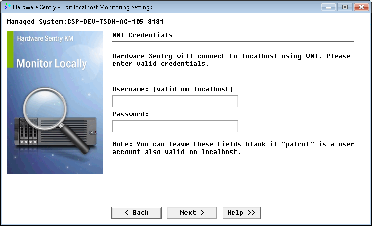 Provide the WMI Credentials or leave blank to use the default PATROL account credentials.