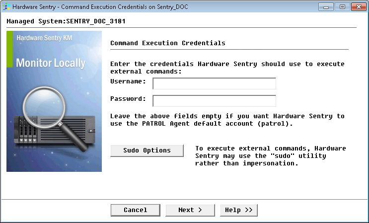 By default, Hardware Sentry uses the PATROL Agent default account (patrol) to execute commands against the local host to collect hardware information. If a different account has been configured, the alternate user account to be used should be provided through the Command Execution Credentials dialog box.