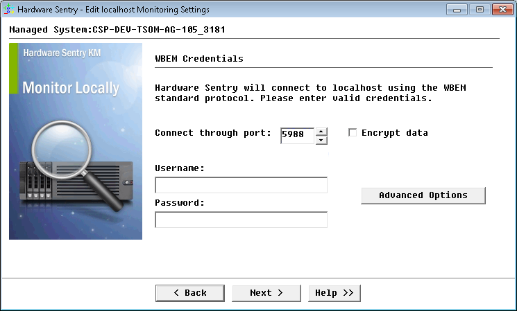 Click Advanced Options to access specific settings related to the WBEM connection:
