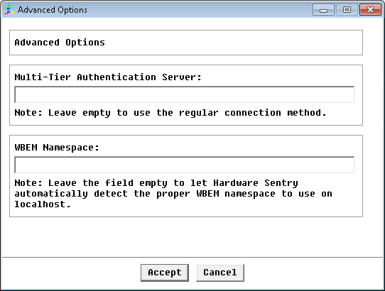 - Enter the WBEM Namespace or leave blank to let the KM automatically detect the proper name (recommended). If the WBEM credentials are not provided, Hardware Sentry will authenticate using the credentials provided in the previous panel (WBEM Credentials). This therefore disables multi-Tier authentication.