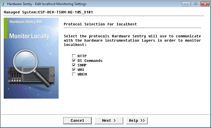 By default, Hardware Sentry detects and preselects the protocol(s) that can be used to communicate with the local host. You can however modify this selection to suit your specific needs.