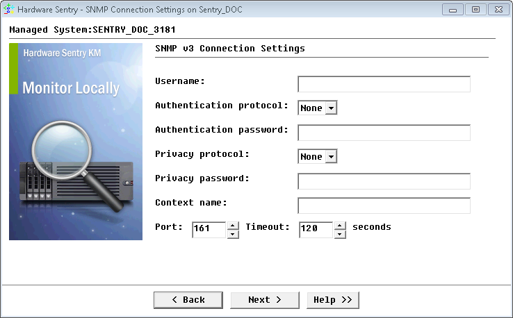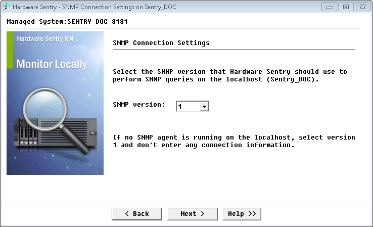 Hardware Sentry can leverage the SNMP protocol to collect hardware information about the local host. In that case, an SNMP agent must be installed on the monitored host and the SNMP connection configured through the SNMP Connection Settings wizard. The information required by Hardware Sentry will vary according to the version used: