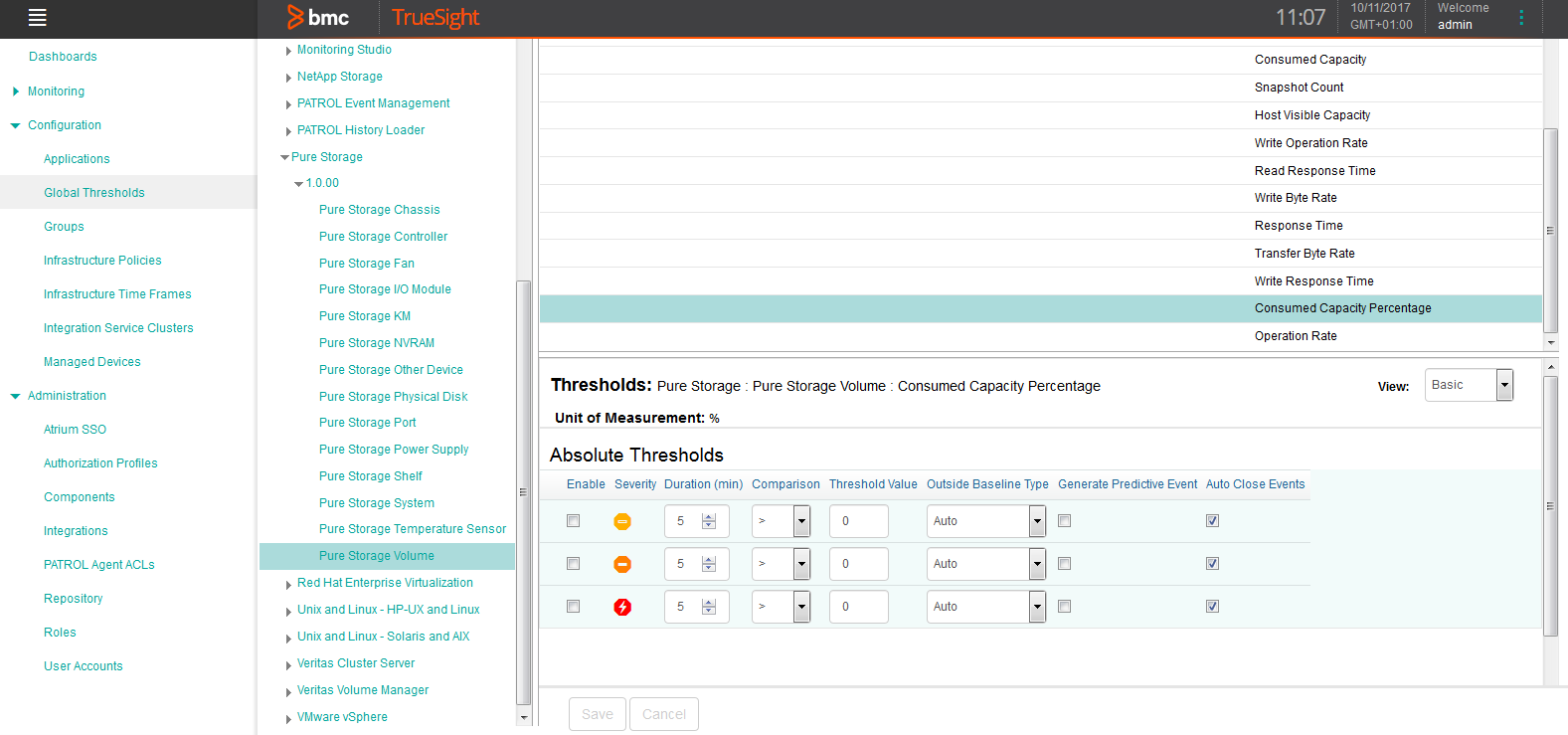 By default no global thresholds are set in TrueSight. To take full advantage of Pure Storage KM for PATROL, Sentry Software recommends setting thresholds as specified in the Reference Guide.