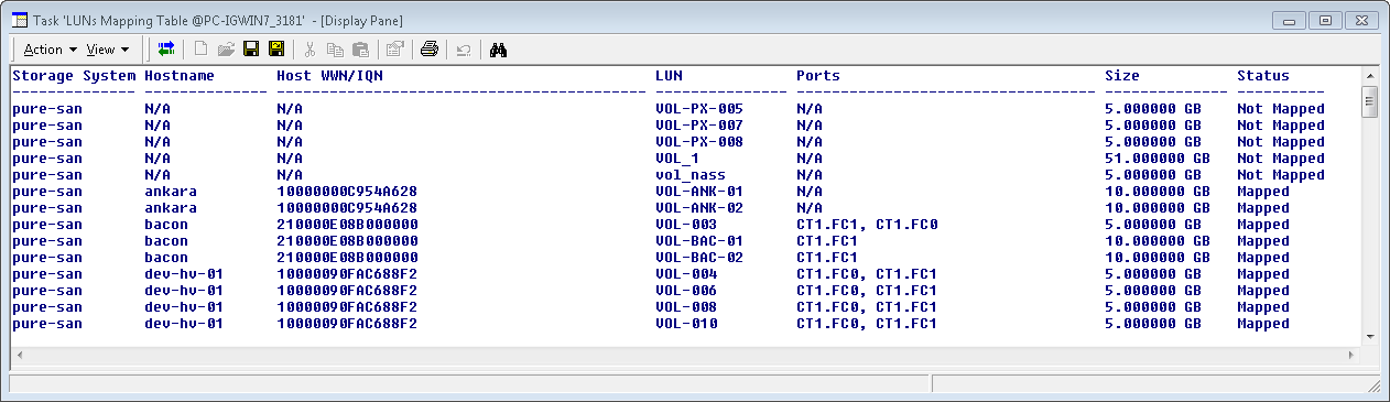 Select LUNs Mapping Table to list mapped and unmapped LUNs. The .csv file generated for this report consists in the following comma-separated data: Storage System, Hostname, Host WWN/IQN, LUN, Ports or Size.
