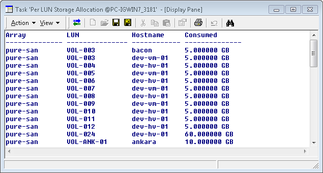 - In the console, right-click the KM main icon or storage system icon > KM Commands > Reporting > Per LUN Storage Allocation…