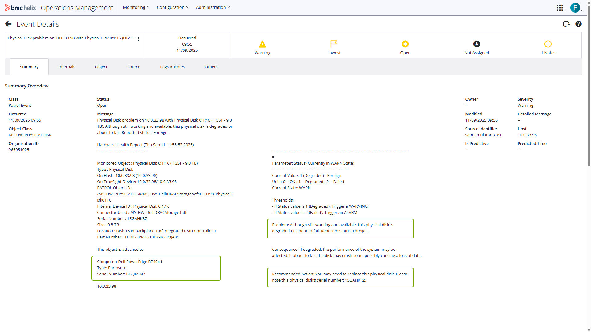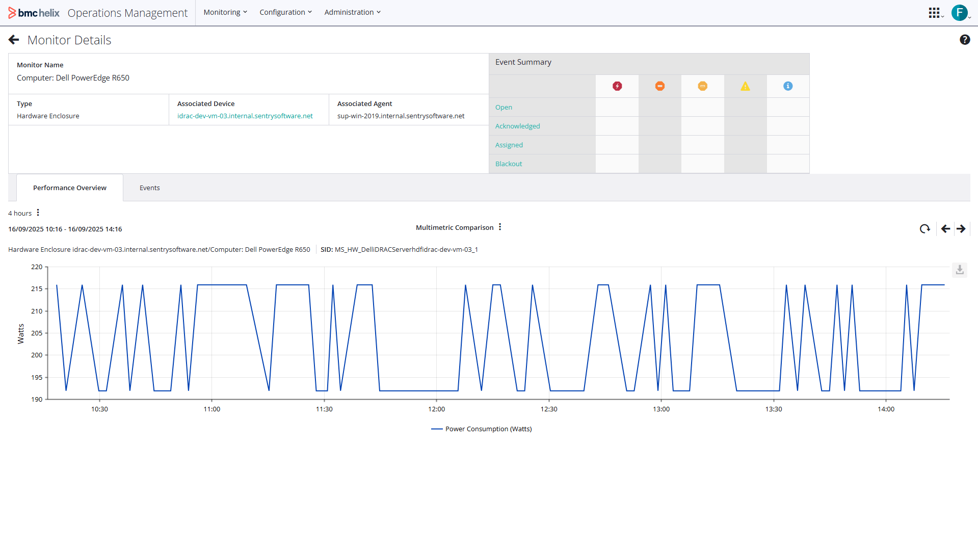 Hardware Sentry KM is a vendor-agnostic hardware monitoring module that consolidates health metrics from servers, storage systems, network devices, and UPS into BMC Helix Operations Management.